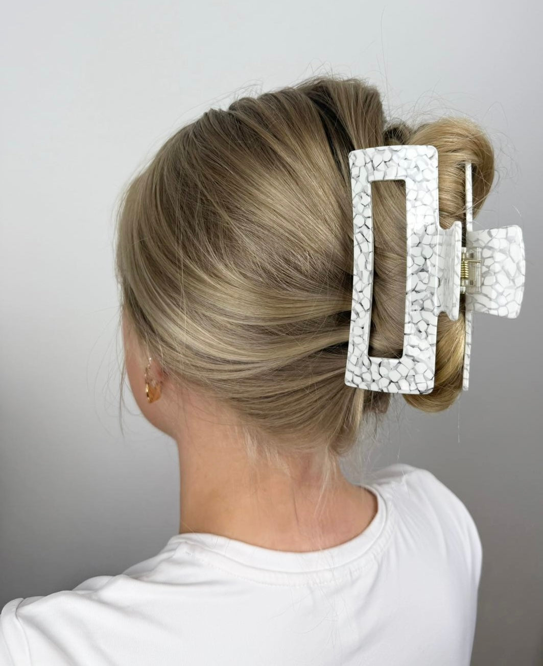 Die Haarklammer Snow zeichnet sich durch ihr elegantes, weißes Design aus, das an zarte Schneestrukturen erinnert. Hergestellt aus hochwertigem, robustem Material, bietet sie sicheren Halt und ist sanft zur Kopfhaut – perfekt für einen minimalistischen, zeitlosen Look.