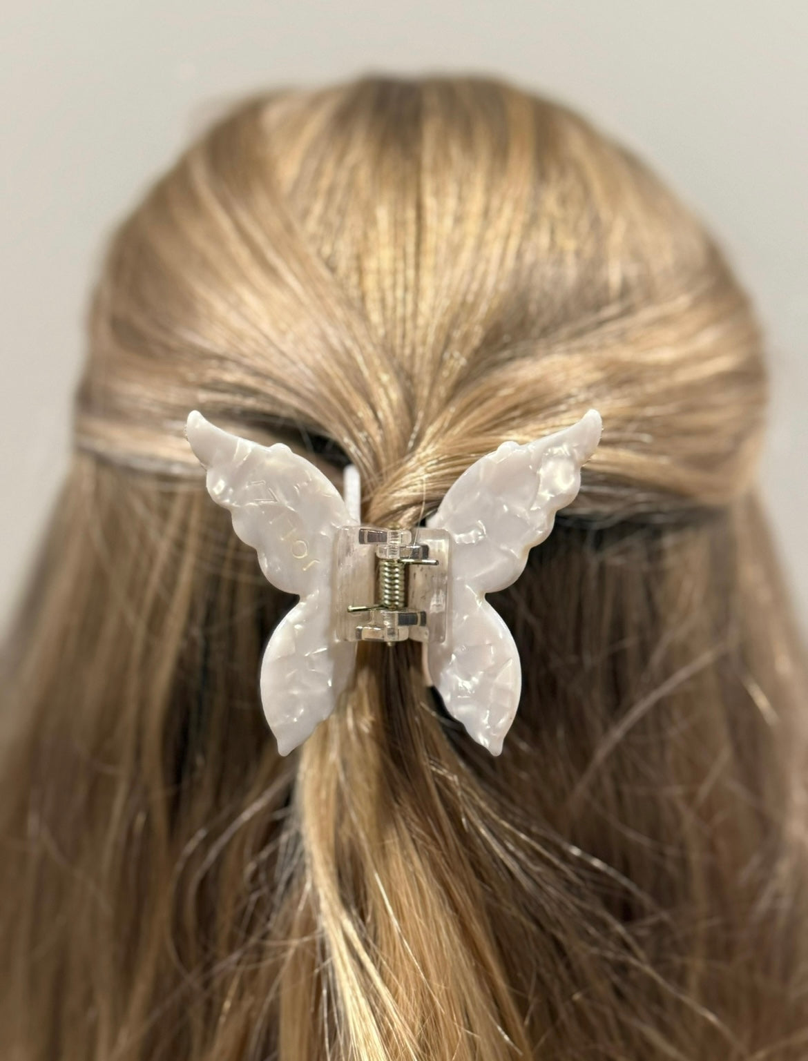 Diese Haarklammer in Schmetterlingsform ist aus biologischem Acetat gefertigt und zeichnet sich durch ihre milchig-weiße Farbgebung aus.