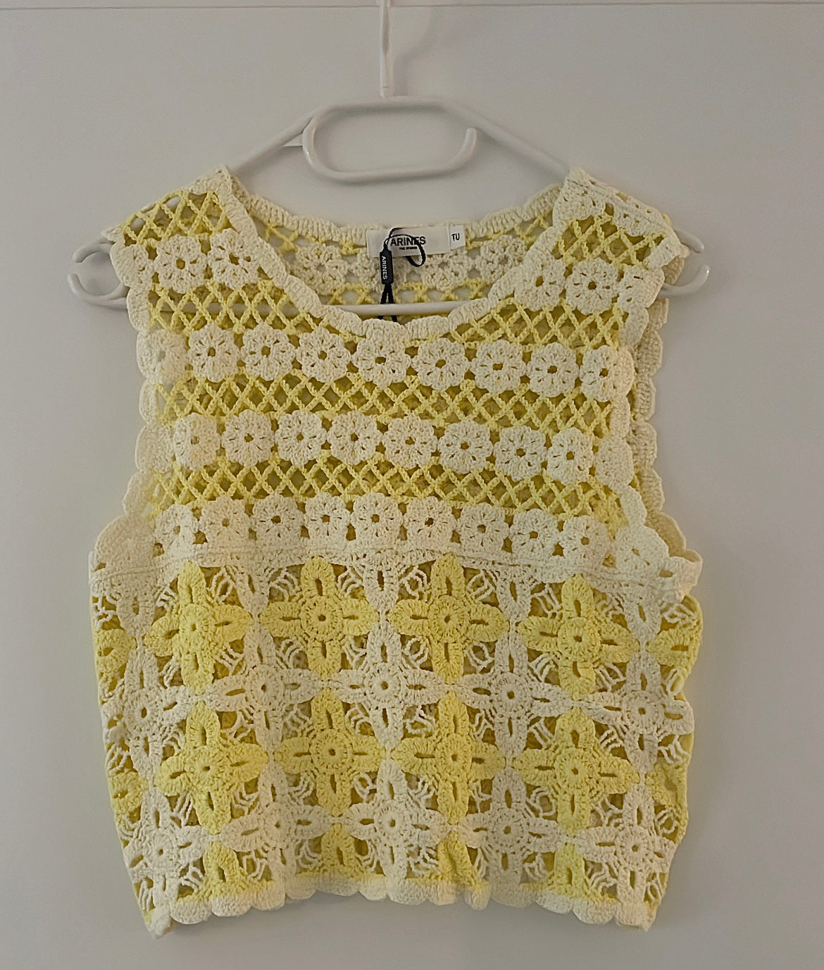 Verspieltes gehäkeltes Crop-Top im Retro-Stil mit floralem Muster. Das luftige Baumwollmischgarn sorgt für ein angenehmes Tragegefühl – perfekt für Sommer, Festivals oder als Layer über Tops und Kleider.