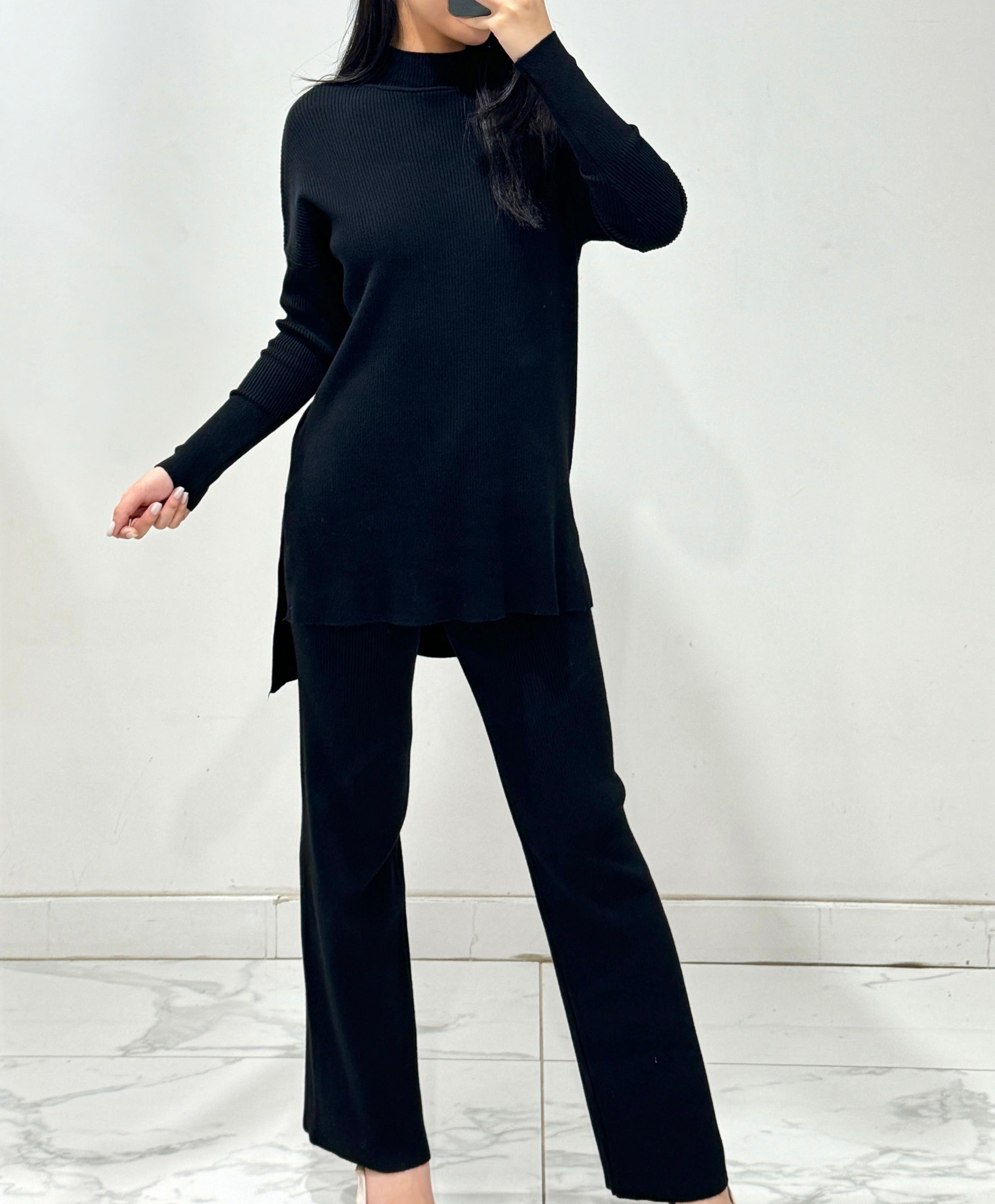 Dieses edle Rippstrick-Set vereint Komfort und Stil auf perfekte Weise. Der weiche, elastische Feinstrick sorgt für ein angenehmes Tragegefühl, während der moderne Schnitt mit seitlichen Schlitzen und leicht ausgestellter Hose eine elegante Silhouette zaubert. Ideal für Alltag, Büro oder gemütliche Stunden zuhause.