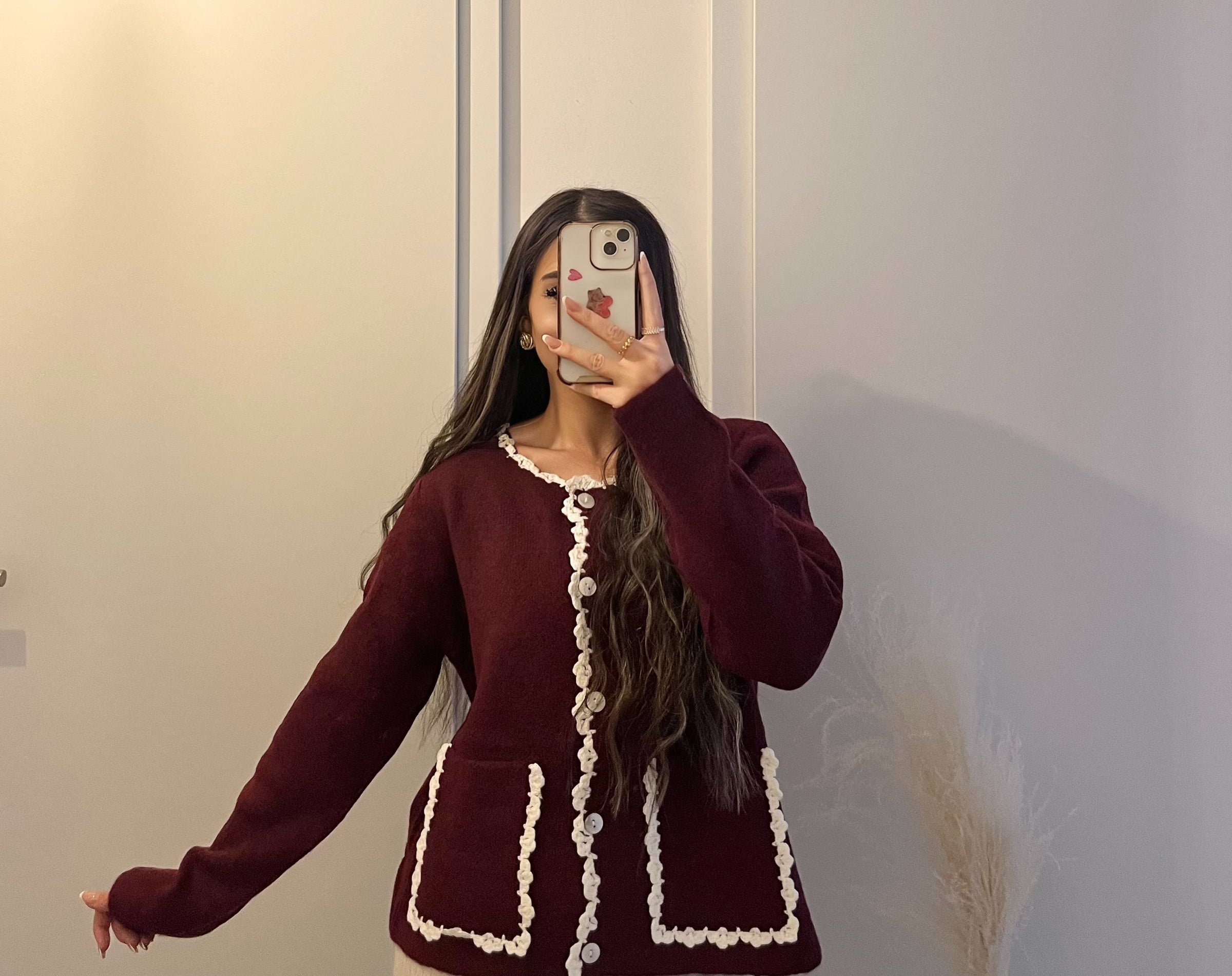 Strickjacke mit Kontrastborte & Knopfleiste – Oversize Cardigan mit Taschen | Bordeaux