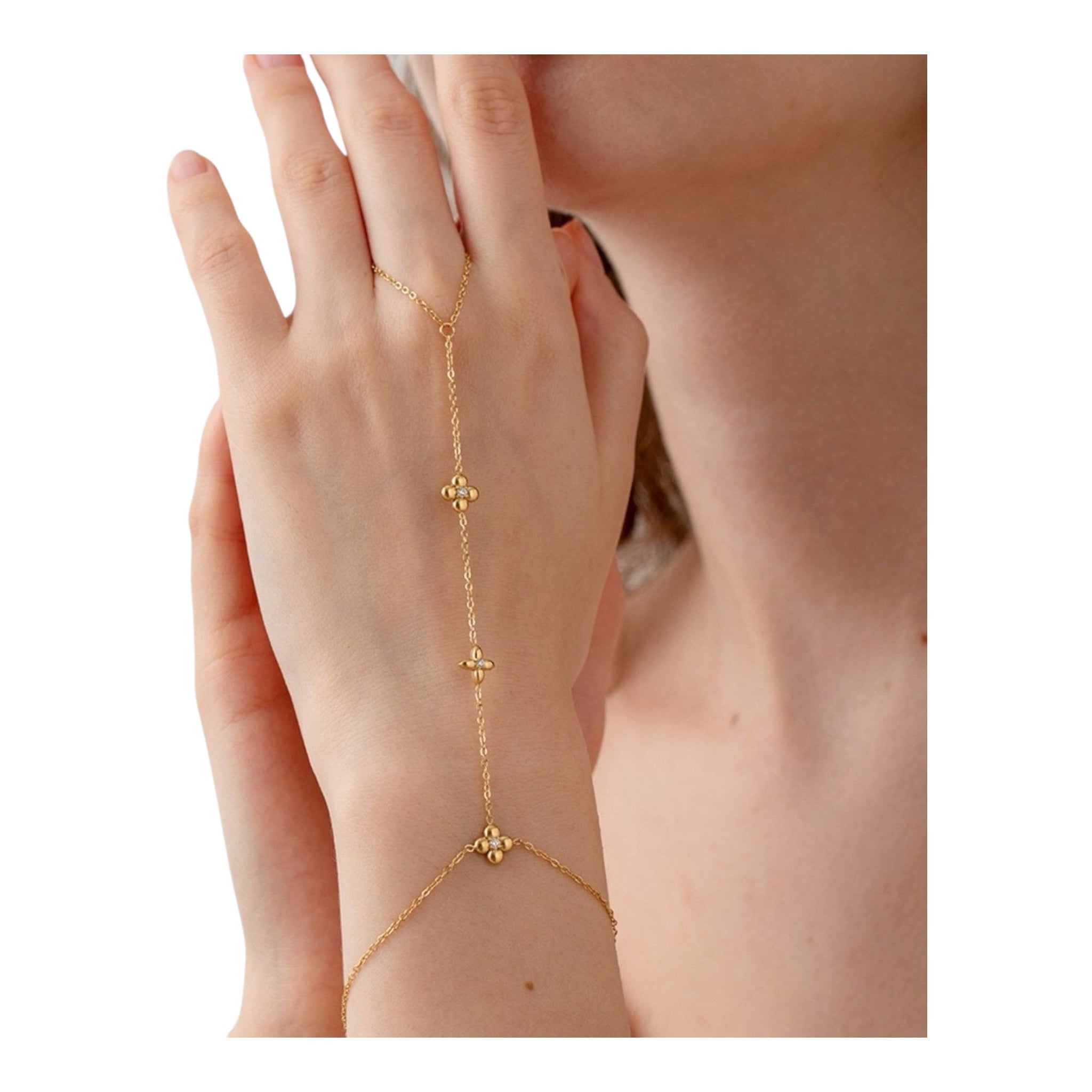 Diese elegante Handkette aus Edelstahl verbindet Ring und Armband zu einem filigranen Schmuckstück. Das minimalistische Design mit feinen Details verleiht jedem Look eine feminine und edle Note. Perfekt für Alltag, Urlaub oder besondere Anlässe.