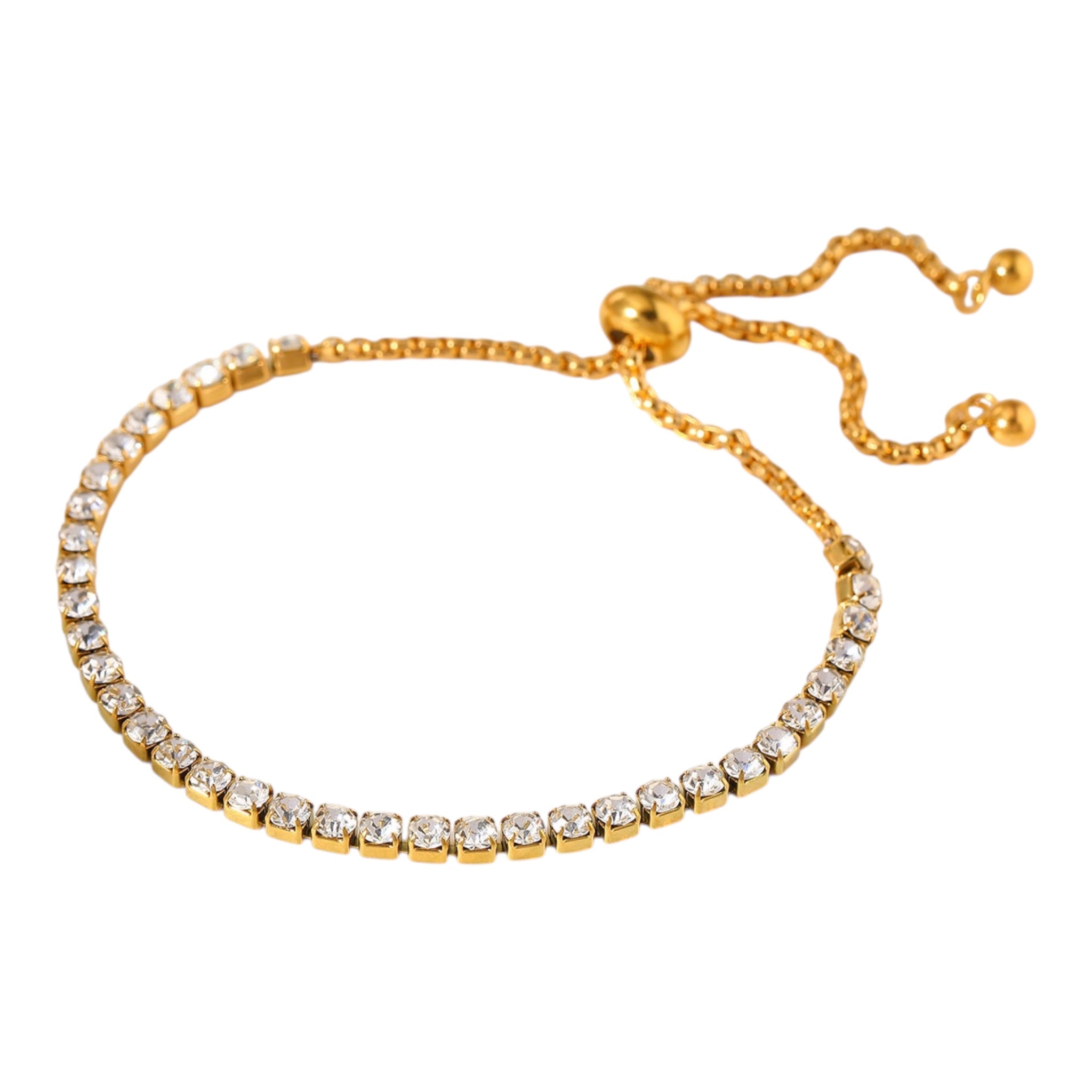 Dieses elegante Zirkonia-Tennisarmband verleiht jedem Look einen Hauch von Luxus. Die funkelnden Zirkonia-Steine sind rundum gefasst und sorgen für ein gleichmäßiges, edles Funkeln. Dank des praktischen Schiebeverschlusses lässt sich das Armband individuell an jedes Handgelenk anpassen. Gefertigt aus robustem Edelstahl mit hochwertiger Vergoldung ist es besonders langlebig, hautfreundlich und ideal für den täglichen Gebrauch sowie besondere Anlässe.