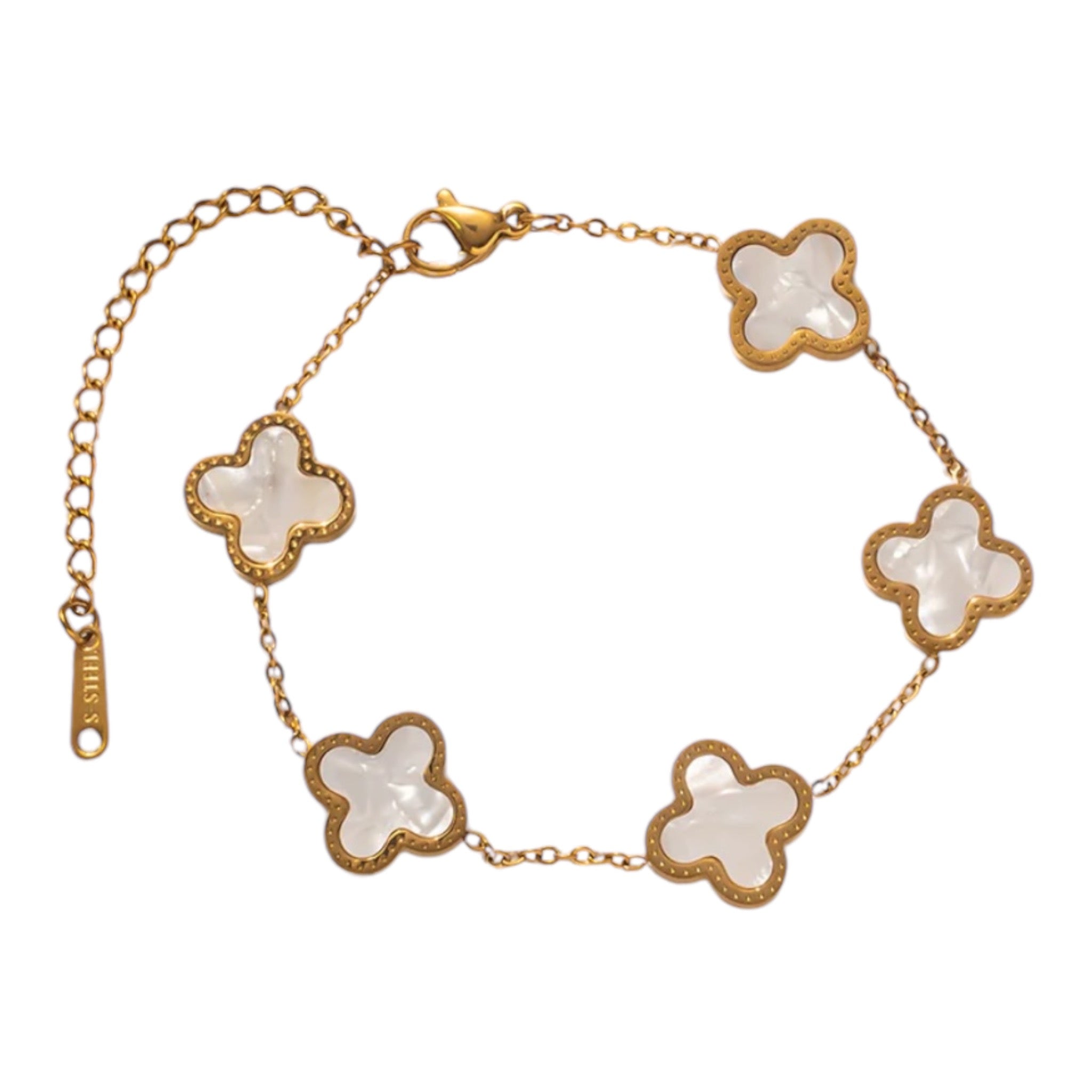 Unser Armband besteht aus hochwertigem Titan, das mit einer feinen Goldschicht veredelt wurde (18 Karat). Die fünf charmanten, kleeblättrigen Elemente sind mit schimmerndem Perlmutt besetzt, das dem Schmuckstück einen edlen und zugleich modernen Touch verleiht. Das Armband ist nicht nur robust und langlebig, sondern auch hypoallergen, was es perfekt für empfindliche Haut macht. Es ist mit einem sicheren Karabinerverschluss ausgestattet und lässt sich leicht anpassen, um einen bequemen Sitz zu gewährleisten.