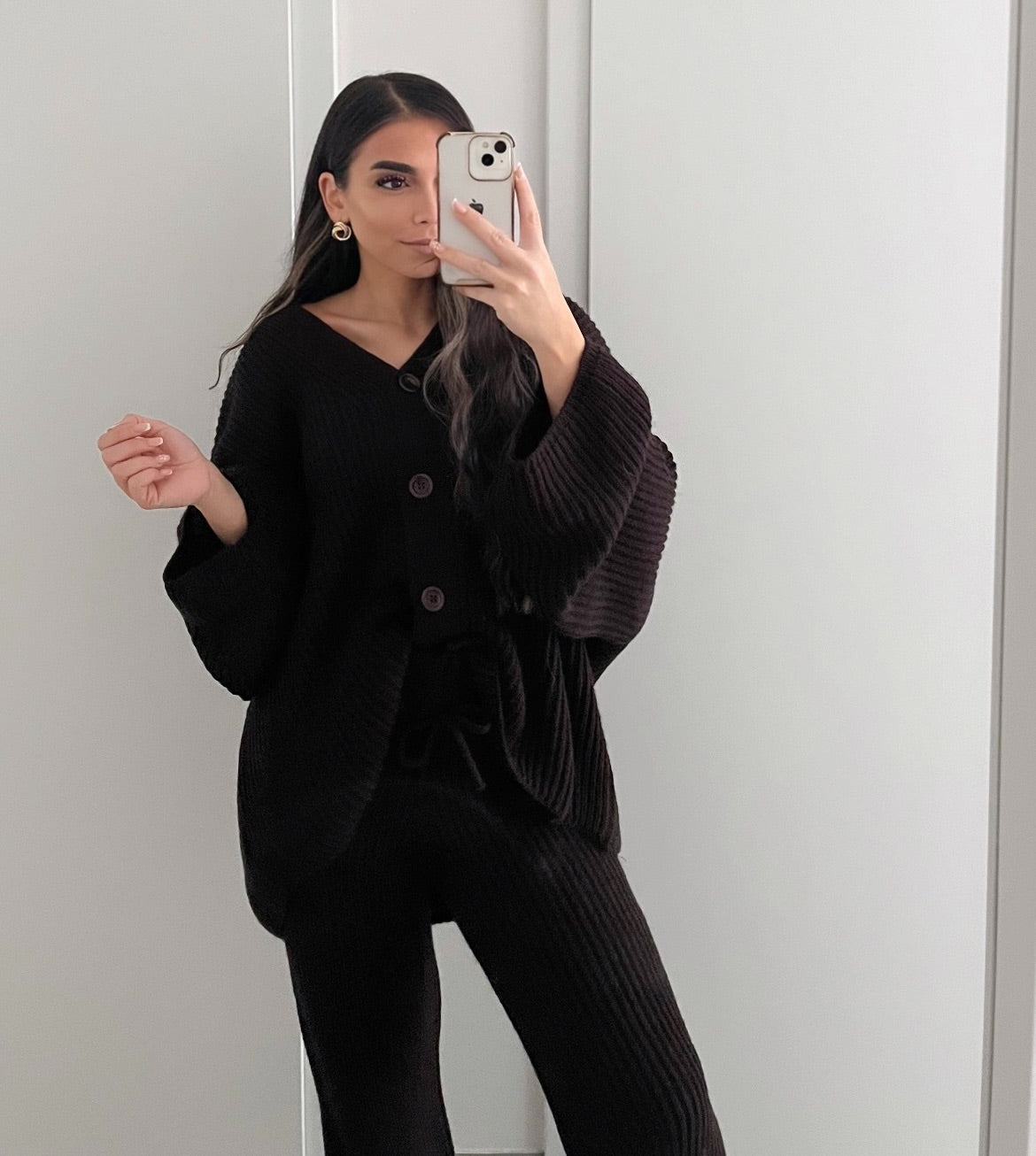 Gemütlich, lässig und stilvoll – dieses Strick-Set besteht aus einer locker geschnittenen Strickjacke mit Knöpfen und einer passenden Hose.